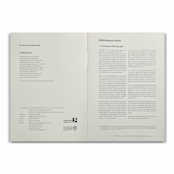 Diese 30-seitige Broschüre stellt eine wertvolle Arbeitshilfe und einen Leitfaden für die Gestaltung einer Kinderbibelwoche zum Thema Abendmahl dar. Darin enthalten sind u. a. Erläuterungen zur Geschichte und Bedeutung des Abendmahls, ein Vorschlag für die Tagesplanung, die Gestaltung eines Kinderbibelwochentagebuches und Ideen für die eigene Zubereitung der Elemente des Abendmahls durch die Kinder. Ebenso sind Vorschläge für Lieder, Psalmen und Gebete enthalten. Damit gelingt eine gute Vorbereitung, eine erlebnis- und erfolgreiche Durchführung und als Höhepunkt die gemeinsame Feier des Abendmahls.